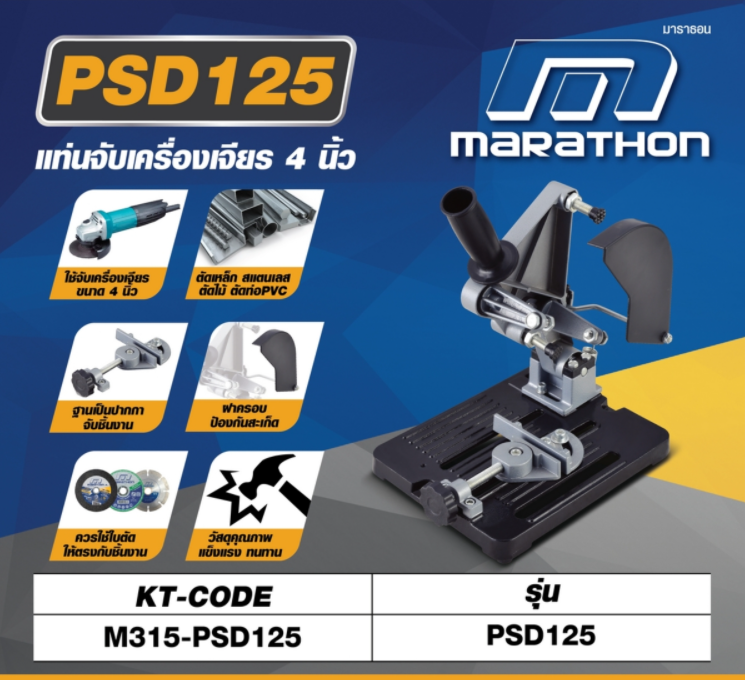แท่นจับเครื่องเจียร MARATHON ขนาด 4 นิ้ว รุ่น PSD125 รายละเอียดสินค้า • ใช้จับเครื่องเจียร์ขนาด 4 นิ้วได้ทุกยี่ห้อ ใช้สำหรับการตัดชิ้นงานที่ต้องการความแม่นยำเที่ยงตรง สามารถปรับองศาในการตัดได้ • เป็นแท่นเจียรใช้ตัดชิ้นงาน ได้ทุกประเภท